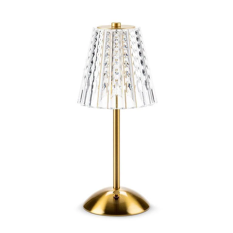 Crafted out of metal and acrylic, the golden base and shaft of this table light is accented with a crystal-laden lamp shade to add illumination and style to any space. Comes with a built-in USB-rechargeable battery.