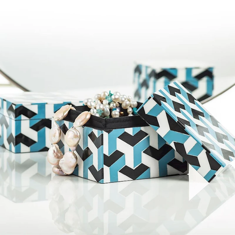 Handmade and hand-finished from wood and resin with an intricate allover mosaic pattern, these boxes are perfect for storing precious keepsakes, or simply adding a touch of elegance to your home decor.