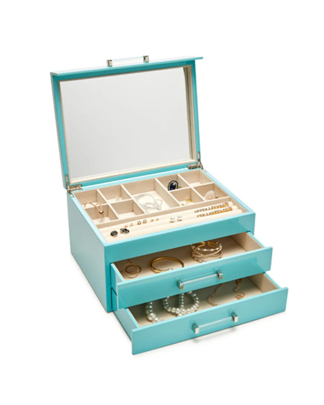 The Chloe Jewelry Box is simple, sleek and modern. This mid-century-inspired jewelry box is a dashing way to store your stuff. The box is designed with an open top and two lower pull out drawers. Finished with high gloss lacquer.