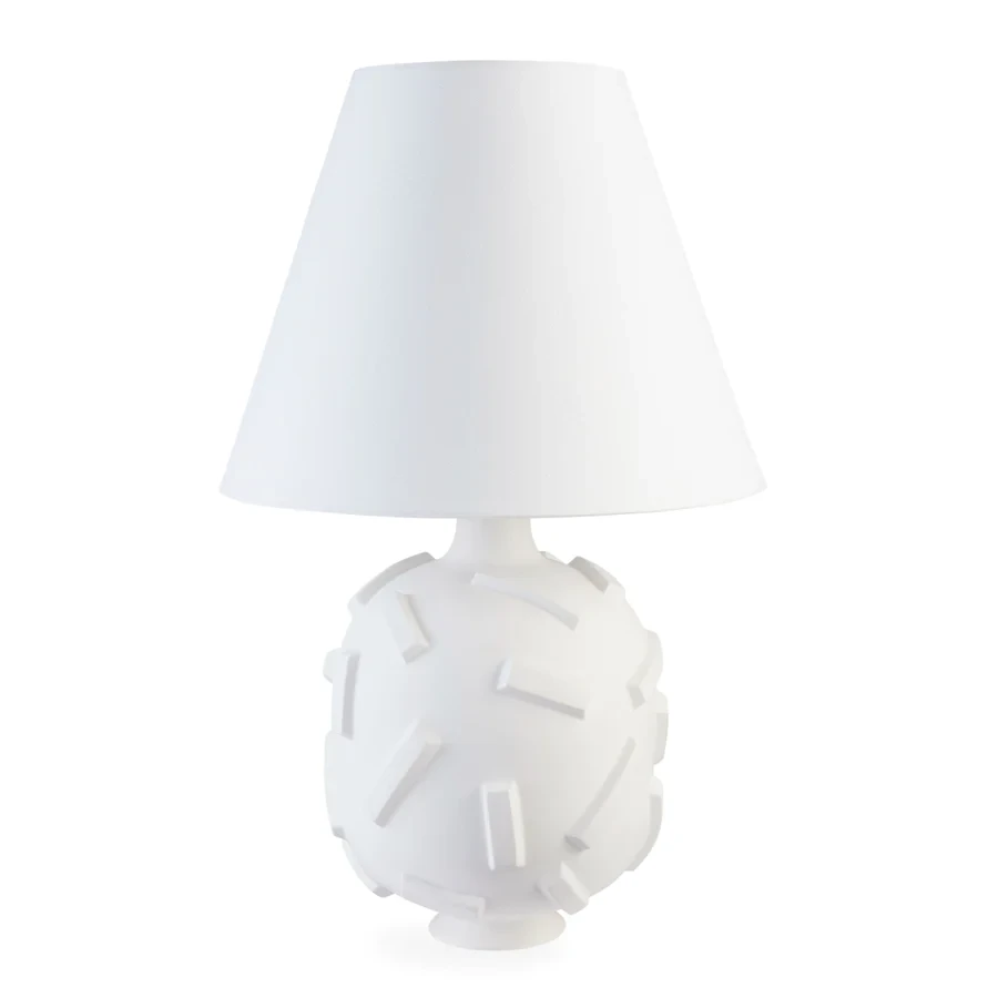 This table lamp features Brutalist-inspired bars and blocks and a nod to modern Memphis style, but in timeless luxe white porcelain.