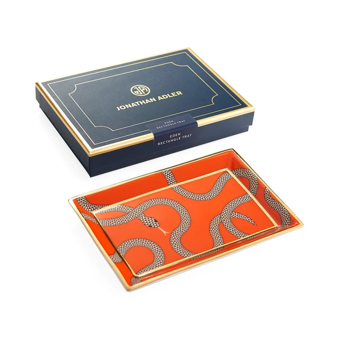 This Eden tray features the slithering serpent on a poppy orange backdrop—a striking addition to any tablescape. Crafted from high-fired porcelain and accented with real sparkly gold for extra glam. Packaged in a nifty gift box, it makes a perfect hostess present.