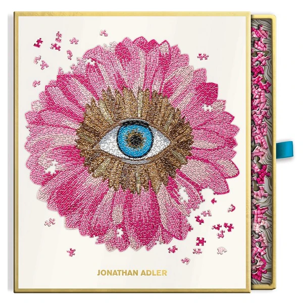 This puzzle of an image of a beautifully handed-beaded pink flower contains 750 foil-stamped pieces and a print of the full puzzle image.