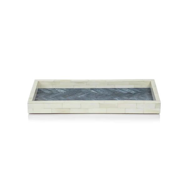 This stunning white bone tray features a nuanced blue herringbone inlay that brings an oceanic feeling to any atmosphere. Pair it with its matching smaller size to complete your decor.