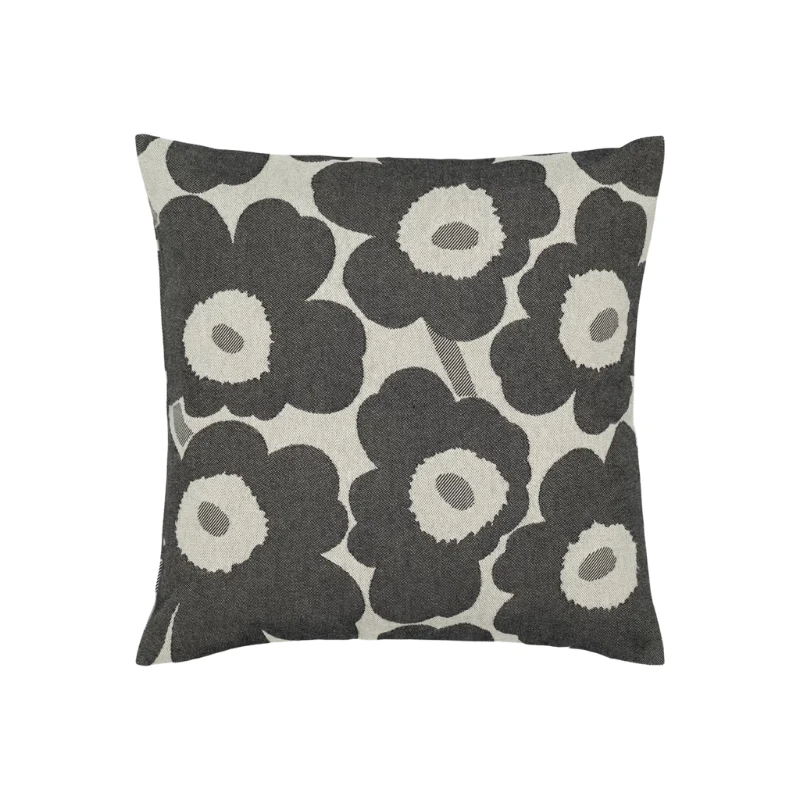 The Pieni Unikko pattern cushion cover is made of a cotton and linen blend with a jacquard knit. The cover has a concealed zipper on one side.