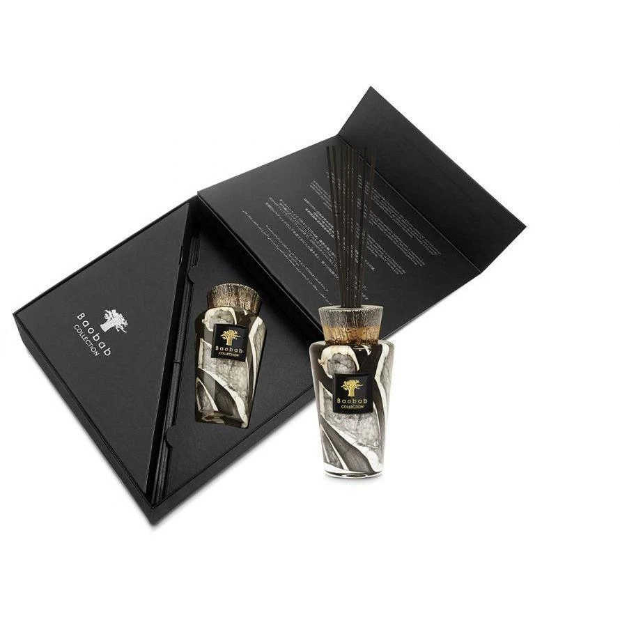 The Totem Marble diffusers are hand-blown by our glass artisans. In reference to the color scheme of precious marble, their ceramic caps are black and silver in accordance with the bottles.