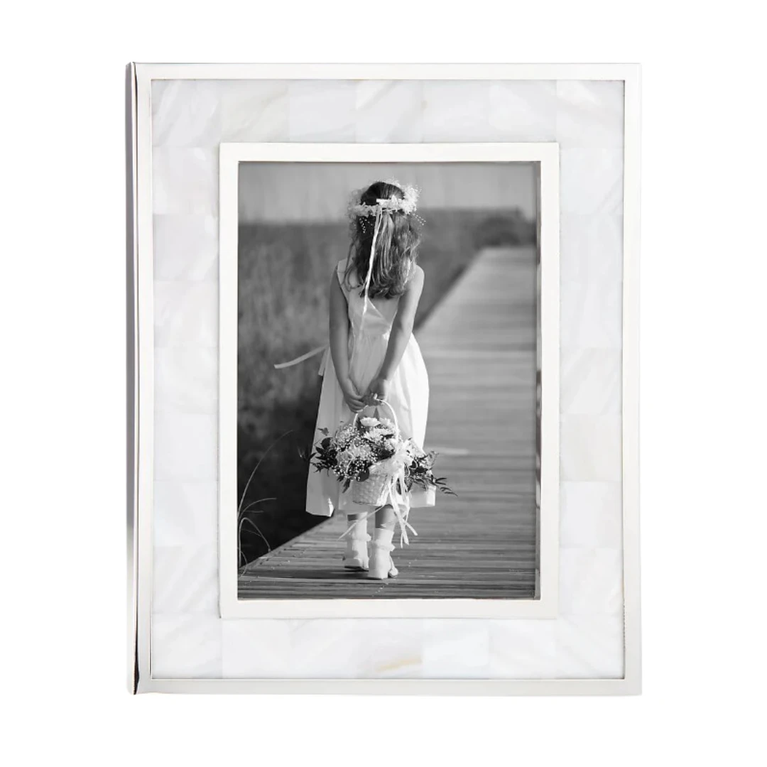 Crafted of white mother-of-pearl with delicate silverplate accents, this tarnish-resistant photo frame is a contemporary addition to a side table or nightstand.
