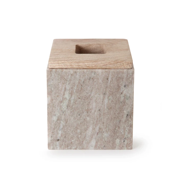 Crafted from natural marble and featuring mango wood accents, this beige-toned collection adds a modern-meets-earthly delights appeal to any bathroom.
