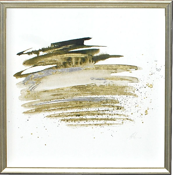 Expressive ink wash drawing accented with dramatic brush strokes of silver and gold.